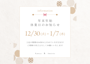 2025年も沢山の祝福に、節目に、記念日に携わらせていただき本当にほんとうにありがとうございました。 上記の通り、2025,12,30(火)~2026,1,7(水)まで年末年始のお休みをいただきます。1年を労い、新たな決意を胸に1月8日(木…